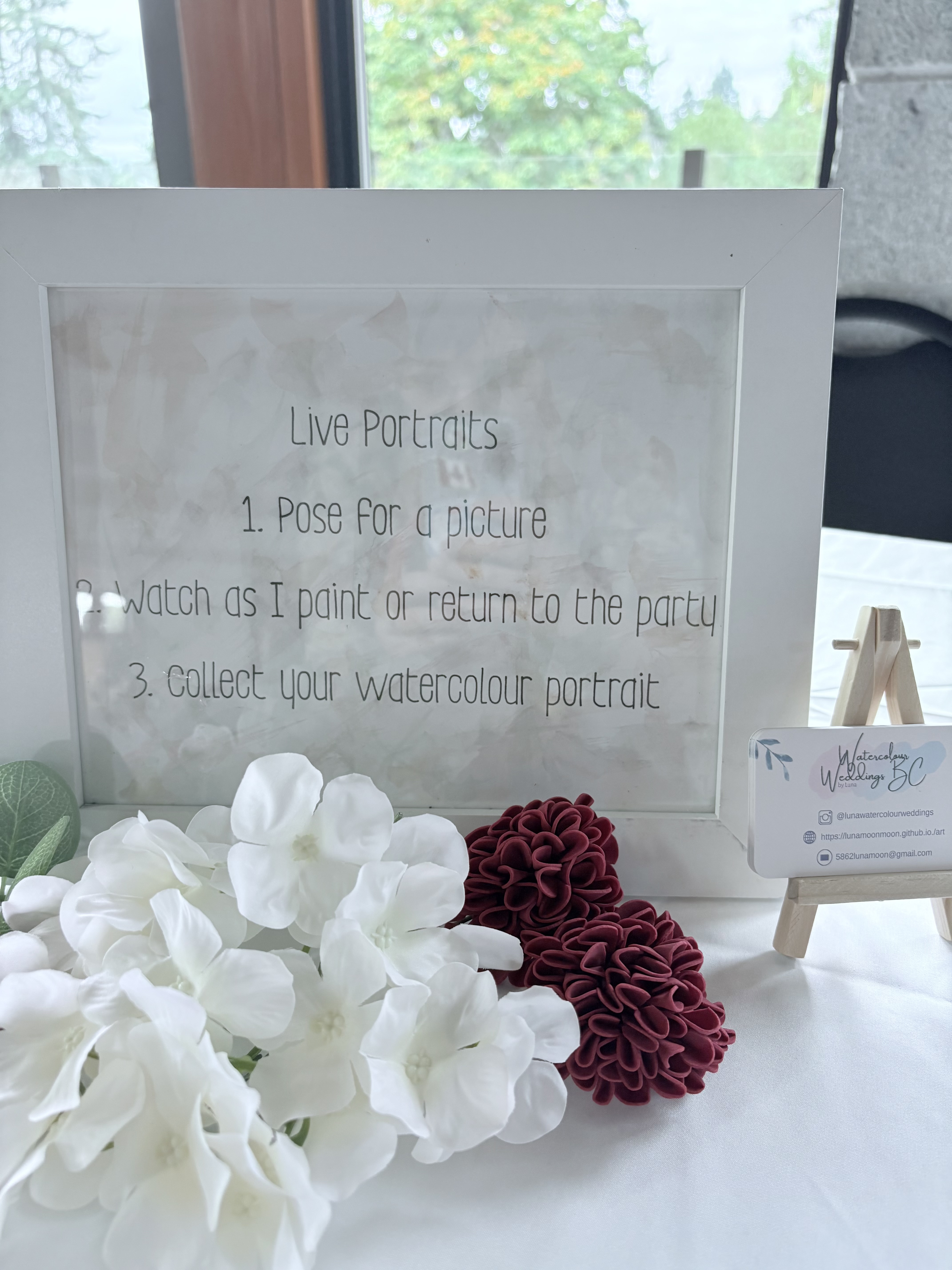 "AMAZING. Like so brilliant and amazing. Luna was a last minute decision and we are so excited that we booked her. She took photos of all the guests and painted them a little favour to take home. She also very kindly let some of the kids sit beside her and paint using her supplies. Best part of the day. Truly she went above and beyond and everyone has been talking about her portraits!" - J and V