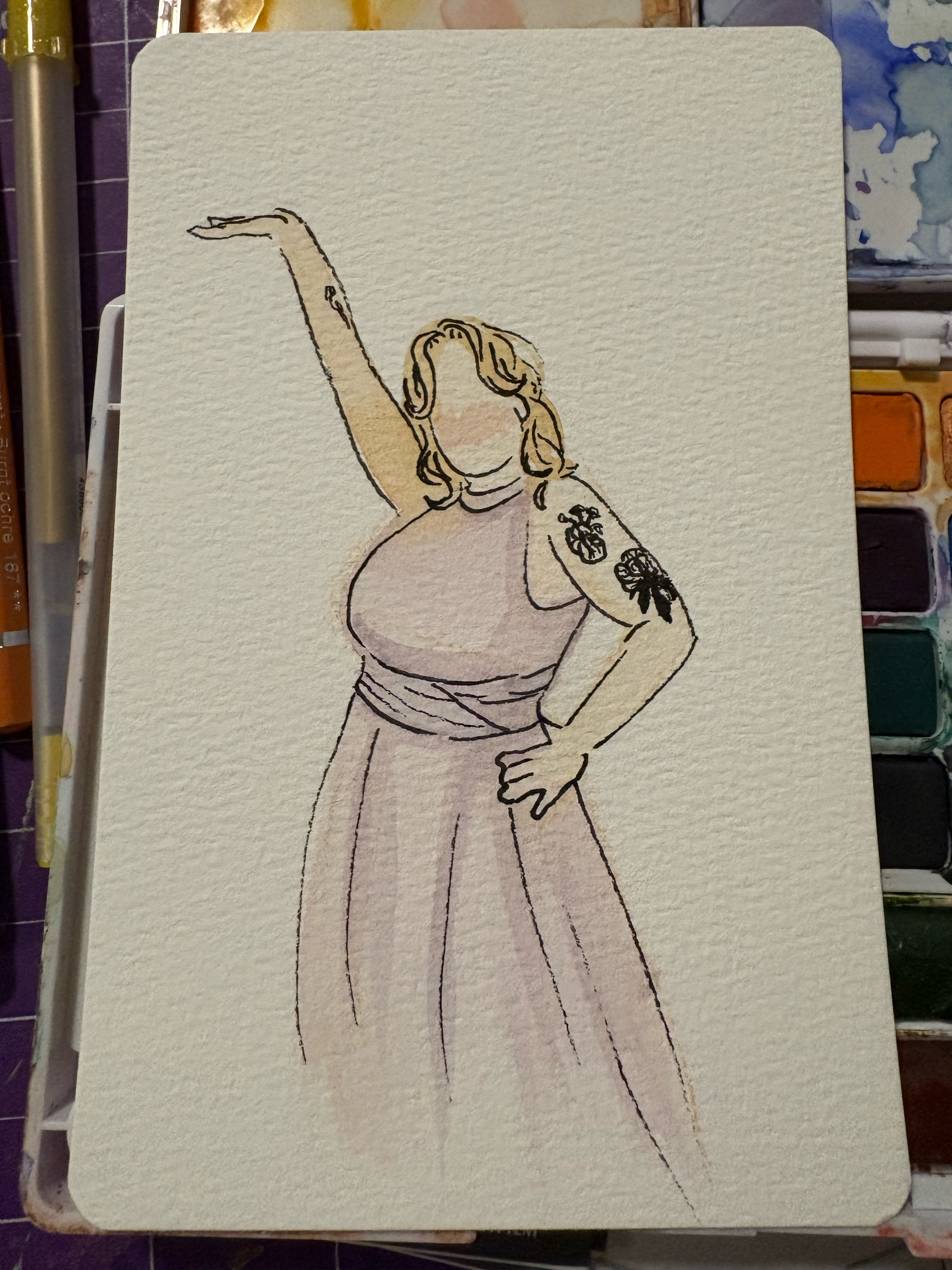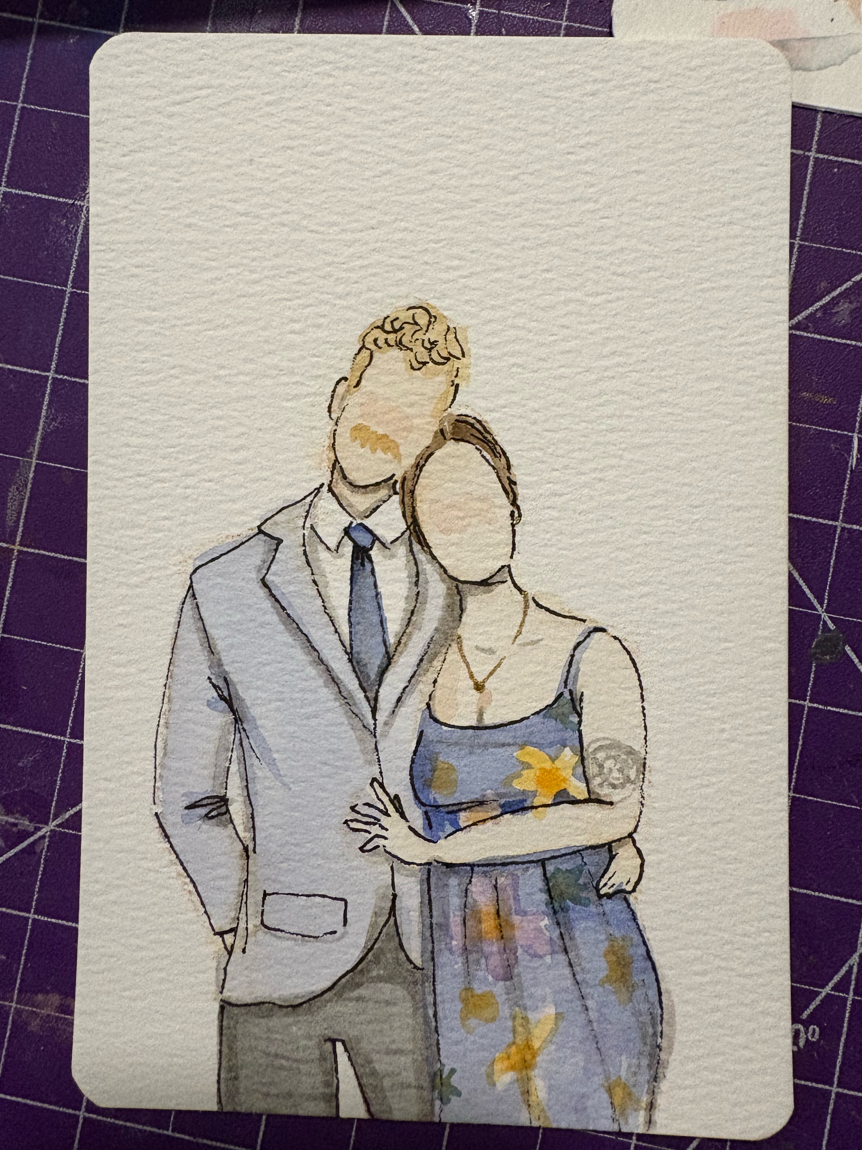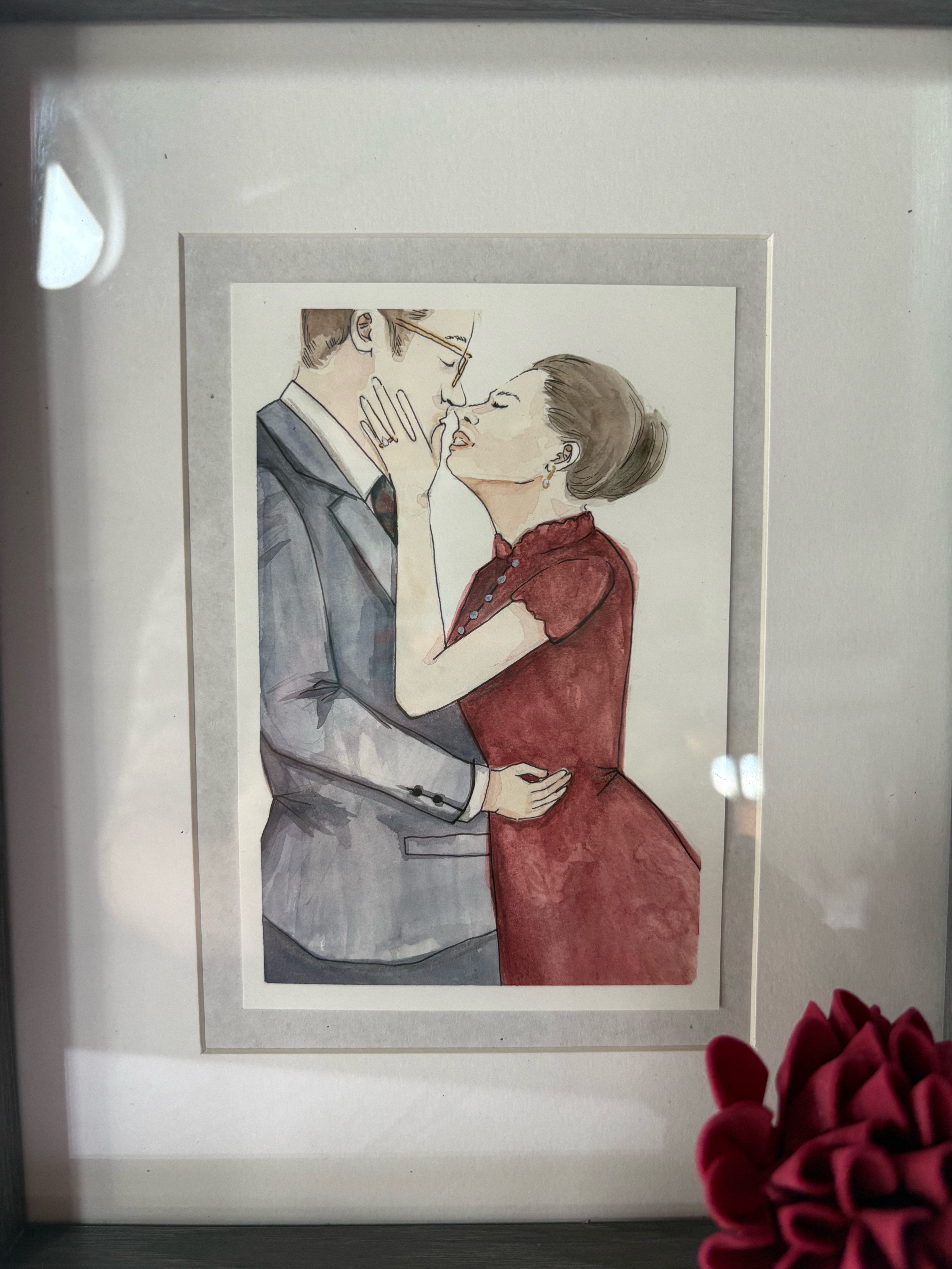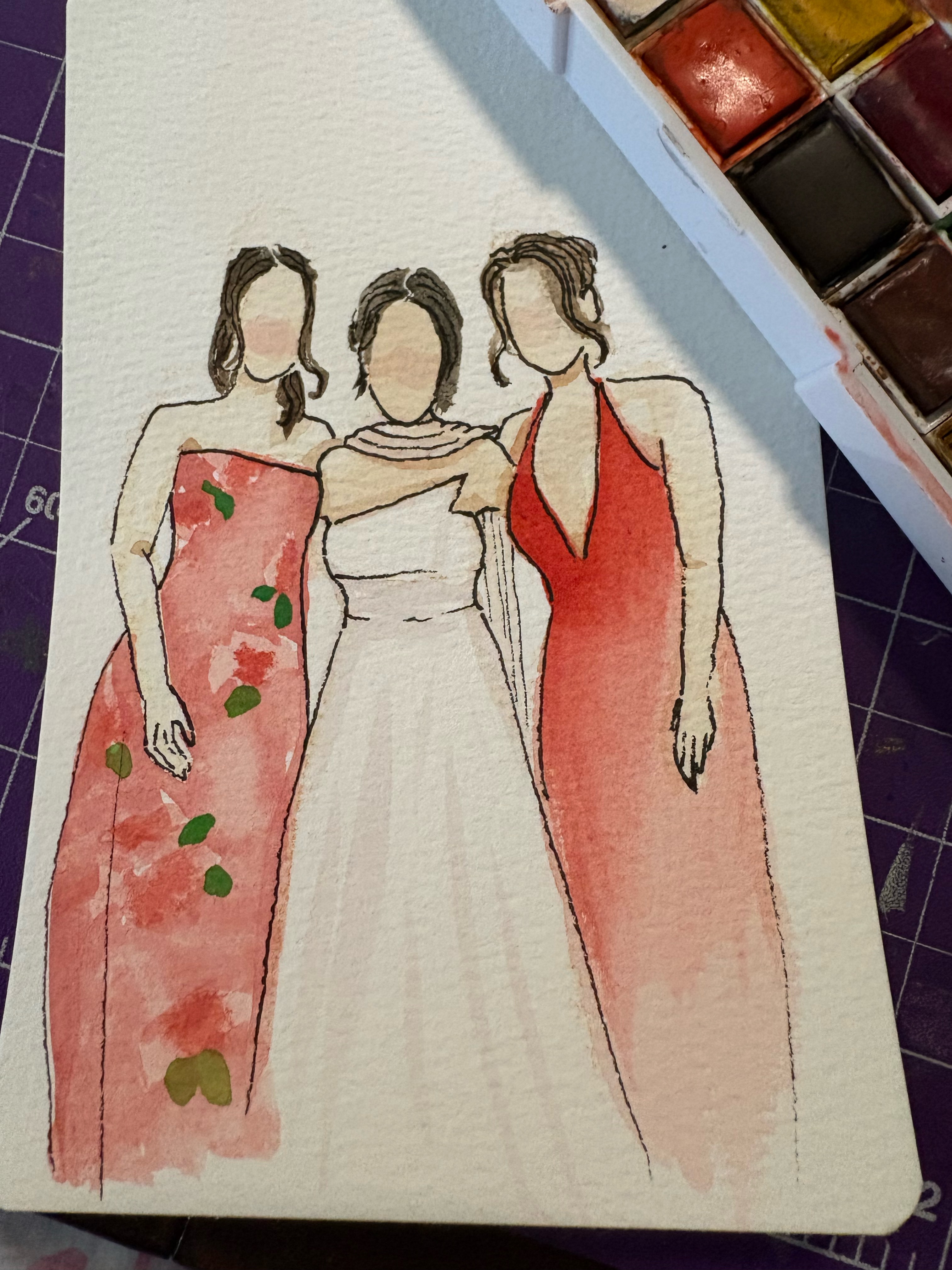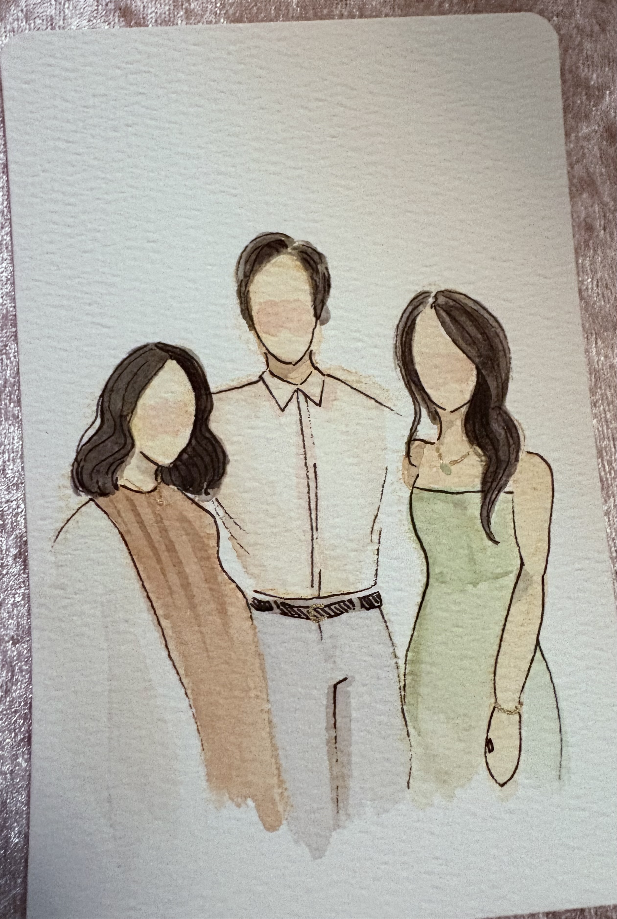 I’ve loved drawing for as long as I can remember, and winning my first set of watercolours from a local art store (thank you Opus!), sparked a lifelong passion for watercolours. Since then, I’ve been creating continuously, always exploring and learning. In 2024, a local bride was searching for a wedding artist online, and I offered to help. It turned out to be such a wonderful experience that I’ve been fortunate to work with more weddings ever since, capturing the special moments and personalities of guests at each one.